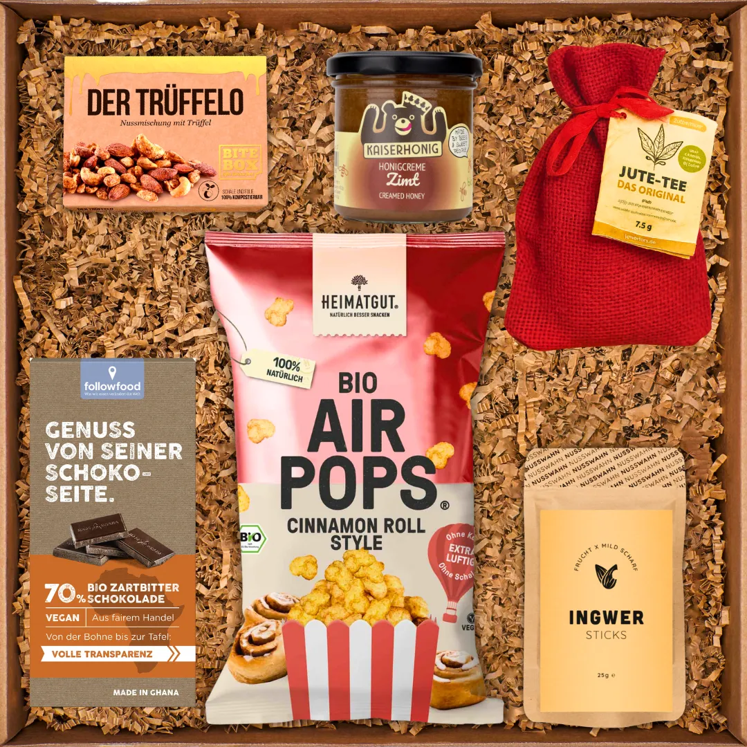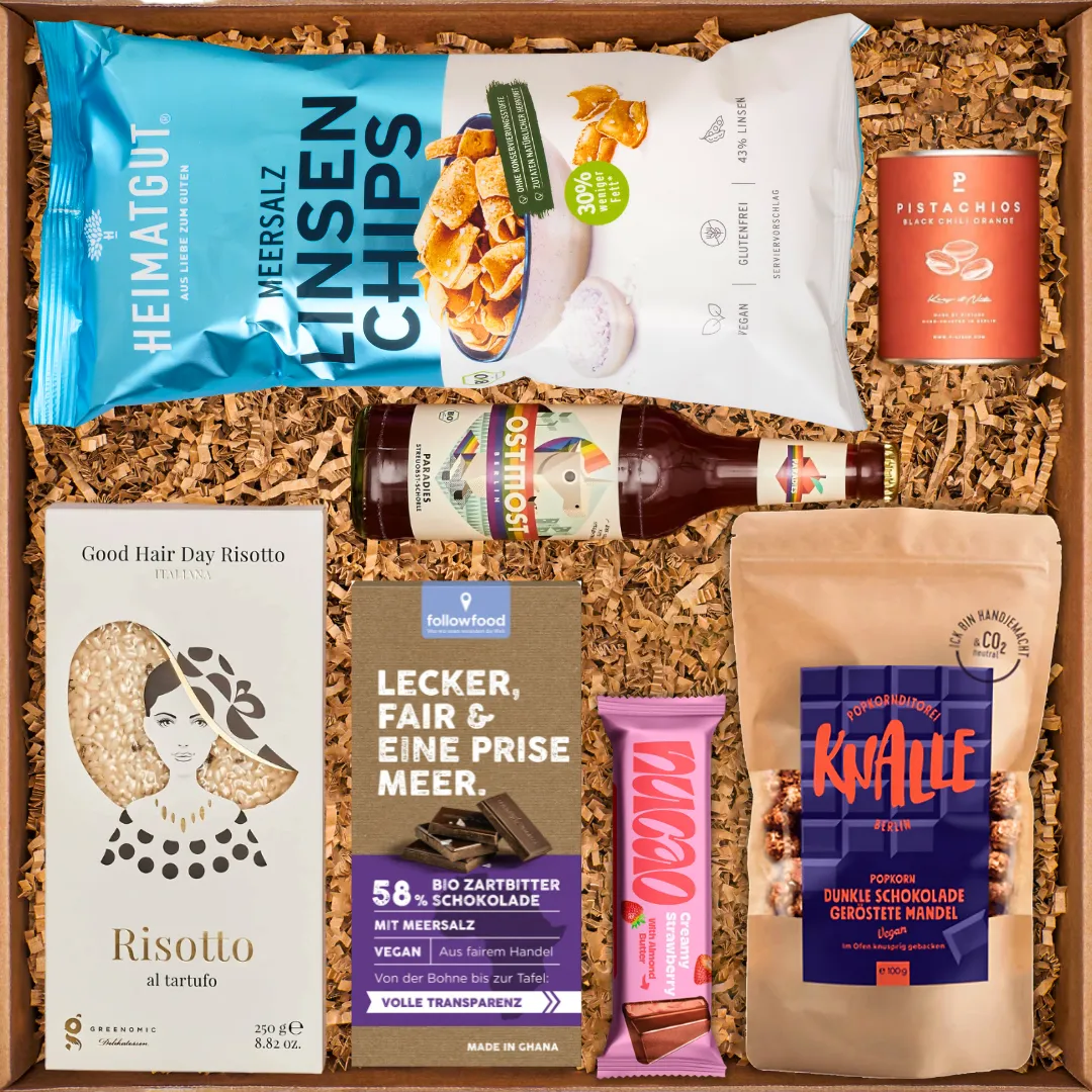 Unsere Geschenkboxen beinhalten ausschließlich Produkte von regionalen Start-ups. Wir unterstützen dabei andere kleine Unternehmen und die Empfänger:innen werden von Produkten begeistert, die sie so nicht kennen. Nachhaltig verpackt, verschicken wir die Geschenkboxen noch am selben Tag der Bestellung (bei Bestellung vor 12:00 Uhr)